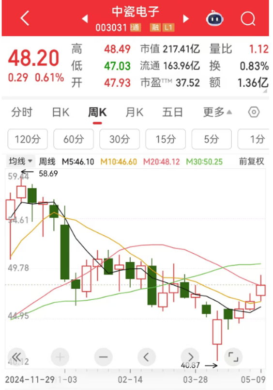 此外,中瓷電子最新滾動(dòng)市盈率為37.52倍,估值處于近十年歷史低位。公司今年一季度實(shí)現(xiàn)凈利潤1.23億元,同比增長48.81%;近期該股股價(jià)表現(xiàn)亮眼,周K線已三連陽。