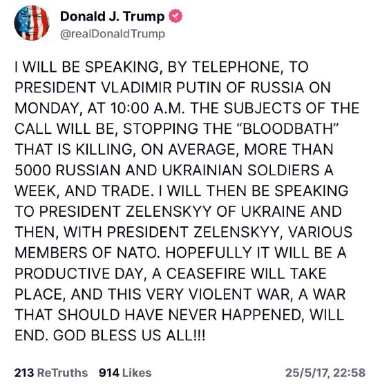 美國(guó)總統(tǒng)特朗普在其社交媒體發(fā)言稱將于周一上午10點(diǎn)與俄羅斯總統(tǒng)普京通話,主要議題是討論停止俄烏沖突以及貿(mào)易問題。