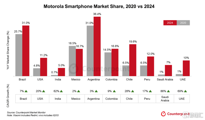 拉丁美洲(LATAM)占據(jù)其全球出貨量近一半,巴西和墨西哥成為主要驅(qū)動力。在巴西,2024年摩托羅拉智能手機市場份額同比增長至31.0%,2020 - 2024年復(fù)合年增長率(CAGR)為7% ;墨西哥2024年市場份額雖有小幅下滑至16.7%,但CAGR也有2%。