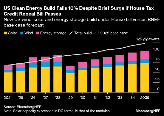 如果參議院在其預算版本中不弱化稅收抵免取消規(guī)定,或者眾議院和參議院之間的談判使最終法案更接近眾議院的版本,那么部署可再生能源和儲能的成本將上升,新增裝機總量將下降。