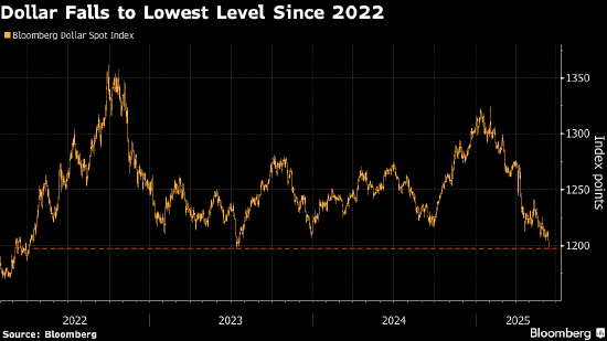 由于市場(chǎng)擔(dān)憂美國關(guān)稅政策及經(jīng)濟(jì)前景,彭博美元指數(shù)跌至三年來的更低水平。