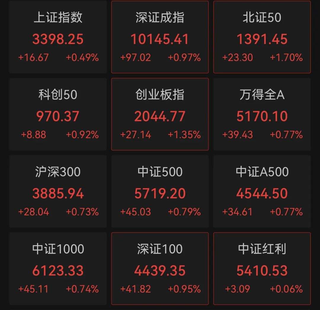 A股開盤漲跌不一,其中,上證指數(shù)微跌0.04%,深證成指上漲0.26%,創(chuàng)業(yè)板指上漲0.35%。隨后上證指數(shù)快速拉升并翻紅,截至發(fā)稿,上證指數(shù)上漲0.49%,深證成指上漲0.97%,創(chuàng)業(yè)板指上漲1.35%,北證50指數(shù)上漲1.7%;全市場超4300只個股上漲。