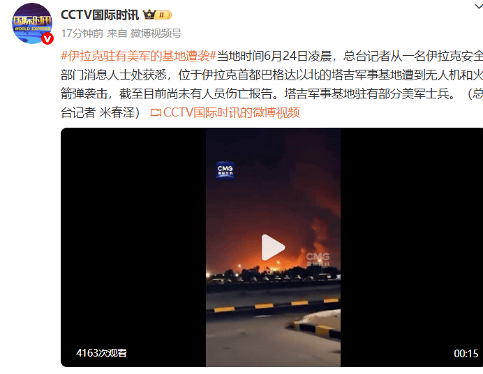 據(jù)CCTV國際時訊消息,當?shù)貢r間6月24日凌晨,總臺記者從一名伊拉克安全部門消息人士處獲悉,位于伊拉克首都巴格達以北的塔吉軍事基地遭到無人機和火箭彈襲擊,截至目前尚未有人員傷亡報告。塔吉軍事基地駐有部分美軍士兵。