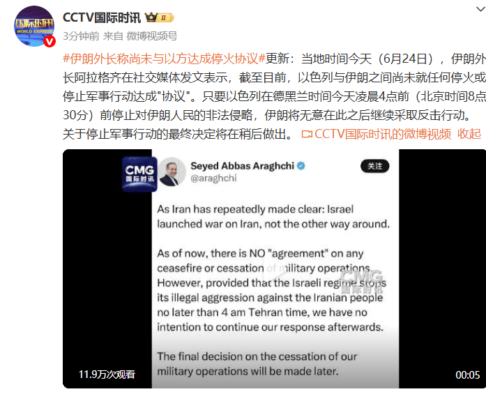 當?shù)貢r間6月24日,伊朗外長阿拉格齊在社交媒體發(fā)文表示,截至目前,以色列與伊朗之間尚未就任何?;鸹蛲V管娛滦袆舆_成“協(xié)議”。只要以色列在德黑蘭時間今天凌晨4時前(北京時間8時30分)前停止對伊朗人民的非法侵略,伊朗將無意在此之后繼續(xù)采取反擊行動。關(guān)于停止軍事行動的最終決定將在稍后做出。