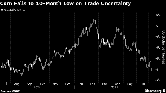 玉米期貨一度跌破每蒲式耳4美元,因美國總統(tǒng)唐納德·特朗普最新貿(mào)易政策措施加劇了市場(chǎng)對(duì)需求前景的擔(dān)憂,而與此同時(shí)該國作物生長(zhǎng)狀況則預(yù)示著產(chǎn)量可能增加。