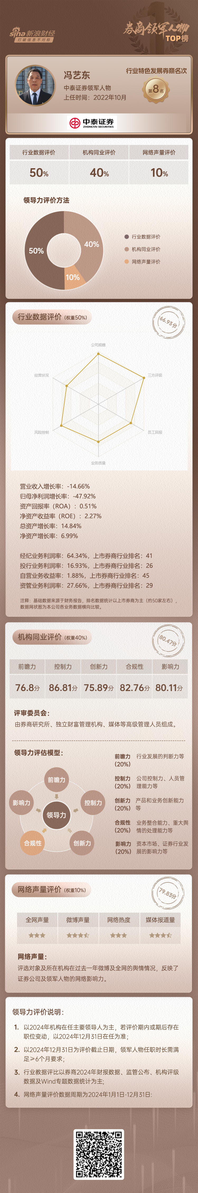2024年,馮藝東先生領(lǐng)導(dǎo)下的中泰證券綜合評(píng)分位于行業(yè)特色發(fā)展券商第8名,其中行業(yè)數(shù)據(jù)評(píng)價(jià)排名相對(duì)靠后。分維度來(lái)看: