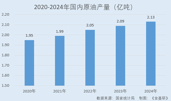 據(jù)國(guó)家統(tǒng)計(jì)局?jǐn)?shù)據(jù),2020-2024年,國(guó)內(nèi)原油產(chǎn)量分別為1.95億噸、1.99億噸、2.05億噸、2.09億噸、2.13億噸。