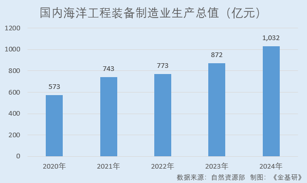 據(jù)自然資源部數(shù)據(jù),2020-2024年,國(guó)內(nèi)海洋工程裝備制造業(yè)生產(chǎn)總值分別為573億元、743億元、773億元、872億元、1,032億元,CAGR達(dá)15.85%。