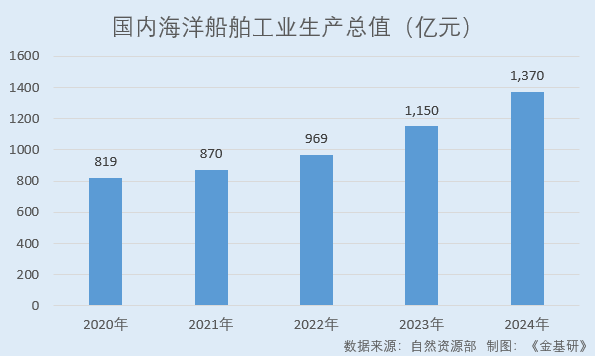 據(jù)自然資源部數(shù)據(jù),2020-2024年,國(guó)內(nèi)海洋船舶工業(yè)生產(chǎn)總值分別為819億元、870億元、969億元、1,150億元、1,370億元。