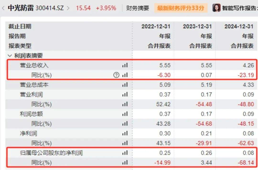 過去三年來,中光防雷的業(yè)績波動較大。2022年至2024年,中光防雷的營收分別為5.55億元、5.55億元和4.26億元,其中2024年同比下滑23.19%;歸母凈利潤分別為2475.58萬元、2560.8萬元和815.89萬元,其中2024年同比大幅下滑68.14%。