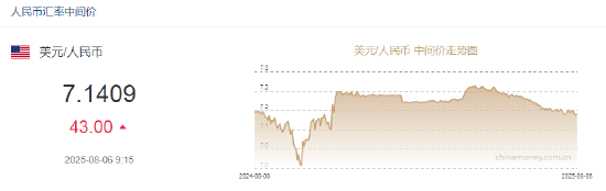 8月6日,人民幣兌美元中間價報7.1409,下調(diào)43點。