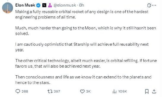 SpaceX首席執(zhí)行官埃隆·馬斯克在回復(fù)一位X網(wǎng)友討論火箭發(fā)射技術(shù)的帖子時稱:“制造一種完全可重復(fù)使用的軌道火箭是有史以來最難的工程問題之一。比登月難多了,這就是為什么它還沒有解決的原因。我對星艦飛船明年將實現(xiàn)完全可重復(fù)使用持謹慎樂觀態(tài)度。