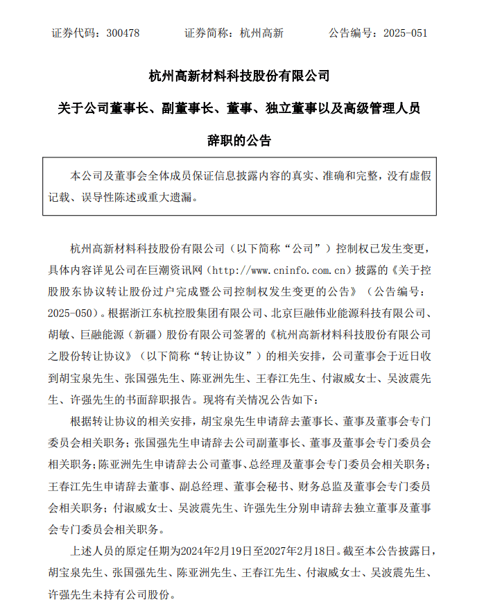 9月4日晚間,杭州高新(300478.SZ)公告,公司董事長(zhǎng)、副董事長(zhǎng)、董事、獨(dú)立董事以及高級(jí)管理人員辭職。