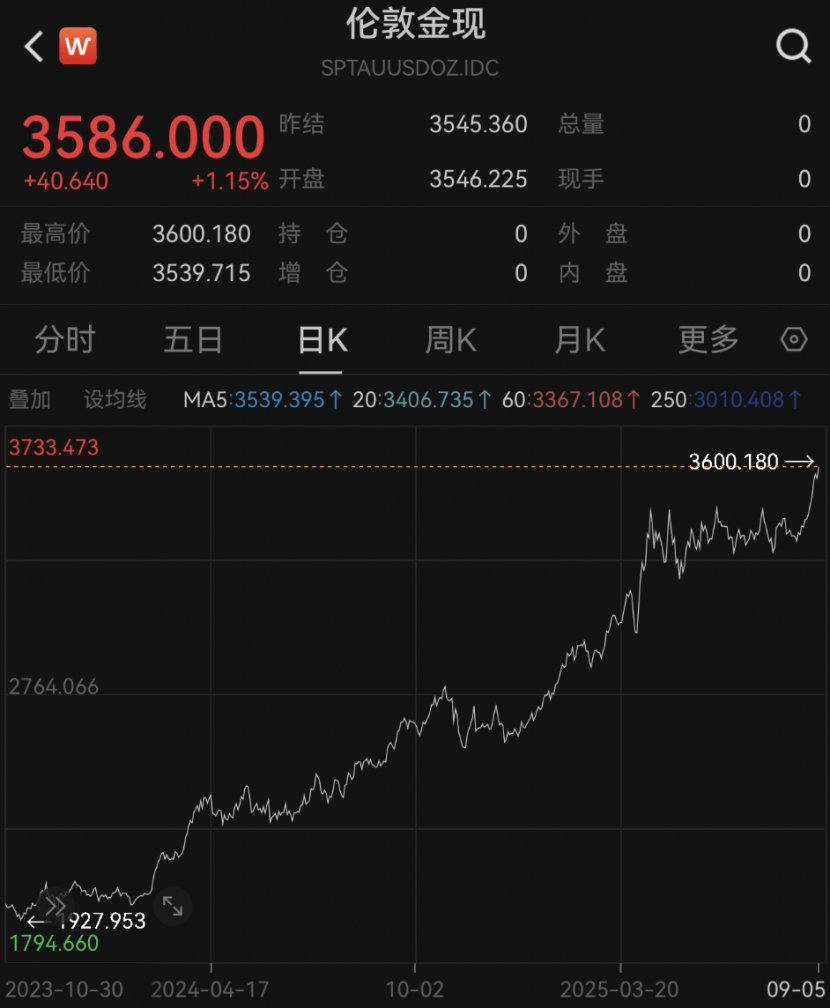 受此影響,現(xiàn)貨黃金價格持續(xù)走強,美東時間9月5日一度突破3600美元/盎司,創(chuàng)出歷史新高。