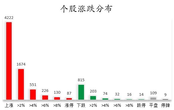 個股漲跌情況,截至收盤,滬深兩市合計4222只個股上漲,815只個股下跌,平盤個股109只,停牌的個股9只。不含當日上市新股,共有87只個股漲停,14只個股跌停。