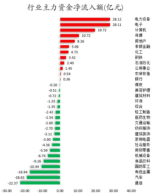 從行業(yè)來看,申萬所屬的31個一級行業(yè),今日有12個行業(yè)主力資金呈現(xiàn)凈流入,其中,電力設備行業(yè)主力資金凈流入最多,凈流入金額為28.12億元;行業(yè)主力資金凈流入居前的還有電子、計算機、傳媒等,凈流入金額分別為28.11億元、19.72億元、10.72億元。19個行業(yè)主力資金呈現(xiàn)凈流出,其中,通信行業(yè)主力資金凈流出最多,凈流出金額為22.37億元;行業(yè)主力資金凈流出靠前的還有汽車、有色金屬、國防軍工、食品飲料、機械設備等,凈流出金額分別為18.63億元、16.94億元、10.44億元、9.26億元、6.74億元。