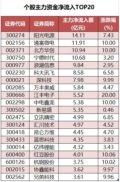 個股來看,今日有2089只個股獲主力資金凈流入,其中,126股獲主力資金凈流入超1億元。陽光電源(300274)主力資金凈流入最多,凈流入金額為14.11億元;主力資金凈流入居前的個股還有通富微電(002156)、北方華創(chuàng)(002371)、寧德時代(300750)、浪潮信息(000977)、科大訊飛(002230)等,凈流入金額分別為11.91億元、10.94億元、10.68億元、9.84億元、8.58億元。