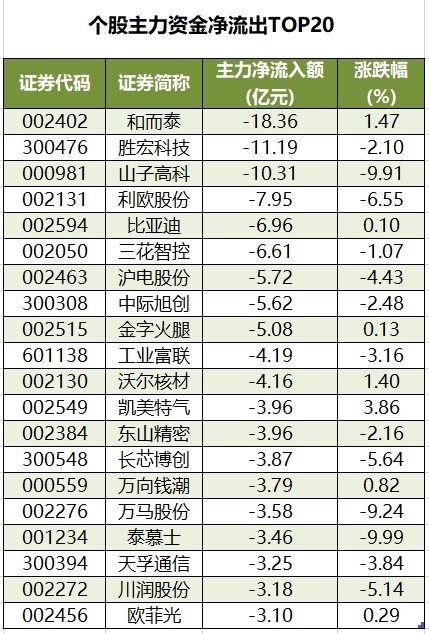 今日有3057只個股被主力資金凈賣出,其中,93股被主力資金凈賣出超1億元。主力資金凈流出最多的個股是和而泰(002402),凈流出金額為18.36億元;主力資金凈流出居前的個股還有勝宏科技(300476)、山子高科、利歐股份(002131)、比亞迪(002594)、三花智控(002050)等,凈流出金額分別為11.19億元、10.31億元、7.95億元、6.96億元、6.61億元。