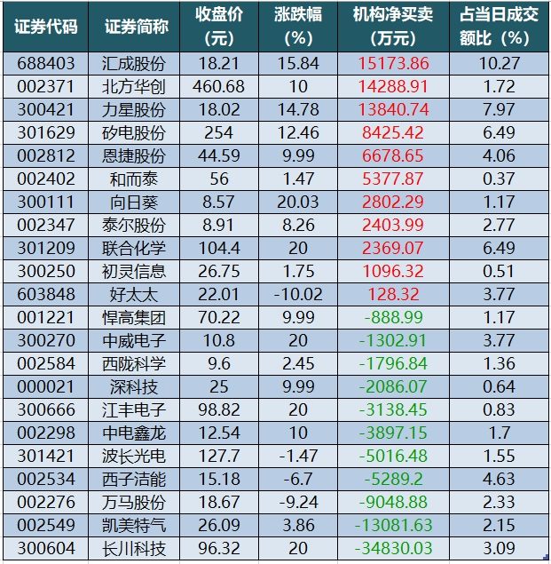 盤后龍虎榜數據顯示,今日機構席位資金合計凈賣出約7791.19萬元。其中,凈買入的個股11只,凈賣出的個股11只。機構凈買入最多的股票是匯成股份,凈買入金額約1.52億元;機構凈買入居前的還有北方華創(chuàng)、力星股份(300421)、矽電股份等股。機構凈賣出最多的股票是長川科技,凈賣出金額約3.48億元;機構凈賣出居前的還有凱美特氣(002549)、萬馬股份(002276)、西子潔能等股。