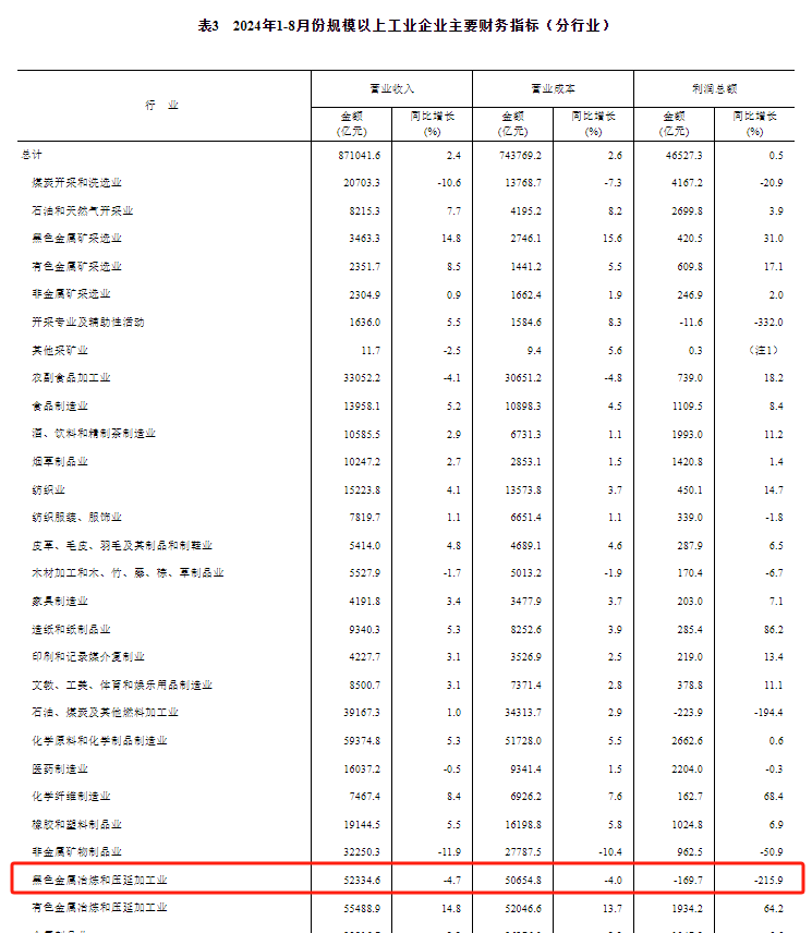 1―8月份, 黑色金屬冶煉和壓延加工業(yè)利潤總額-169.7億元。