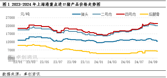 2024年8月下旬以來進口凍品呈現(xiàn)震蕩回落狀態(tài)。根據(jù)卓創(chuàng)資訊數(shù)據(jù)監(jiān)測顯示,截止到9月25日,上海港豬頭(帶耳去舌)自提價為12550元/噸,較8月高點下降10.36%;二號肉為22000元/噸,較8月高點下降3.93%;四號肉為23400元/噸,較8月高點下降1.47%;后腿骨為6250元/噸,較8月高點下滑3.85%。隨著生豬價格繼續(xù)偏弱運行,進口貿(mào)易商出庫積極性較高,進口產(chǎn)品價格仍維持偏弱狀態(tài)。