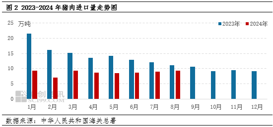 根據(jù)海關總署數(shù)據(jù)顯示,8月份豬肉進口量為9.34萬噸,環(huán)比上漲5.10%,同比減少15.03%;1-8月豬肉進口量為69.52萬噸,同比減少40.52%。2024年年內(nèi)豬肉進口量持續(xù)維持低位,難破“10”萬噸大關,這進一步印證貿(mào)易商年內(nèi)樂觀預期不高,盈利空間不高,采購心態(tài)較為謹慎。另外,下游需求疲軟,進口貿(mào)易商庫存壓力不大,多積極出庫,增加流動資金。