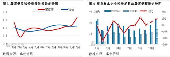 四季度養(yǎng)殖端為沖刺年度出欄計劃,出欄量或增加,根據(jù)市場上已披露的17家上市企業(yè)年度出欄量數(shù)據(jù)可知,1-8月份上市企業(yè)生豬出欄量為9679.31萬頭,占2024年出欄計劃的59.47%,四季度生豬待出欄量為40.53%,因此養(yǎng)殖端或承壓增加出欄量,加快出欄速度,因此屠宰企業(yè)收購難度降低,屠宰量或跟隨增加。另外,四季度屬于傳統(tǒng)的豬肉消費旺季,下游消費或逐步好轉(zhuǎn),二次育肥等豬源或陸續(xù)出欄,進一步增加市場豬肉供應。因此卓創(chuàng)資訊根據(jù)屠宰量季節(jié)性指數(shù)等測算,預計四季度生豬日均屠宰量或環(huán)比三季度增加15%-20%。但需求提振幅度或不及屠宰量增幅,因此四季度生豬及豬肉價格震蕩回落。進口產(chǎn)品受國內(nèi)生豬價格影響,維持減弱運行狀態(tài)。