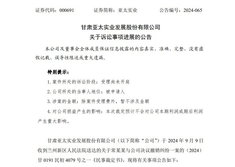 據(jù)亞太實業(yè)披露,公司收到了蘭州新區(qū)人民法院(下稱“新區(qū)法院”)送達的關(guān)于常某某與公司決議撤銷糾紛一案的《民事裁定書》。新區(qū)法院審查后裁定:亞太實業(yè)立即停止依據(jù)2024年7月11日作出的《2024年第三次臨時股東大會決議》(下稱“股東大會決議”)向廣州萬順定向增發(fā)股份。