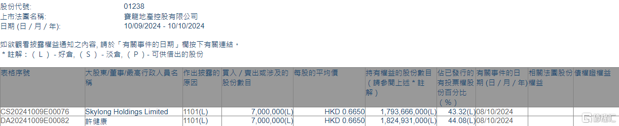 格隆匯10月10日丨根據聯交所最新權益披露資料顯示,2024年10月8日,寶龍地產(01238.HK)獲執(zhí)行董事兼主席許健康在場內以每股均價0.665港元增持700萬股,涉資約465.5萬港元。
