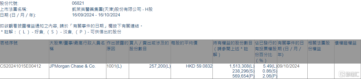 格隆匯10月16日丨根據(jù)聯(lián)交所最新權(quán)益披露資料顯示,2024年10月9日,凱萊英(06821.HK)獲JPMorgan Chase & Co.以每股均價59.0832港元增持好倉25.72萬股,涉資約1519.62萬港元。