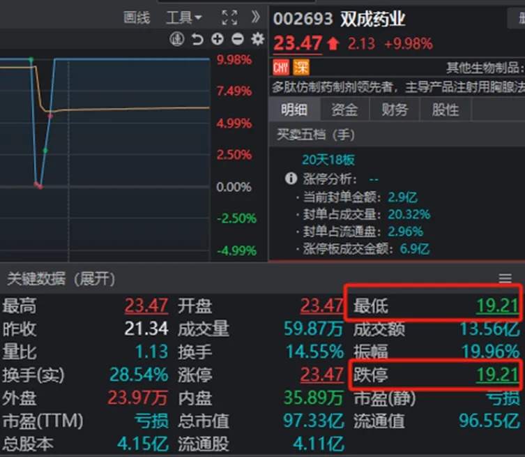 “20天18板”的雙成藥業(yè)(002693),從14:22到14:27,走出了分時線都來不及記錄的“天地天”――但更低成交價確實觸及跌停。