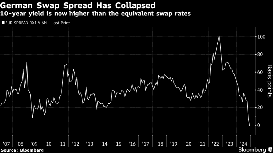 一項廣受關注、衡量對債券供應擔憂程度的指標上升,德國10年期國債收益率創(chuàng)紀錄地首次升破同期限互換利率。30年期國債相較于2年期國債的溢價再次走高,推動利差接近兩年多來的更高水平,這也是財政擔憂日益加劇的另一個跡象。