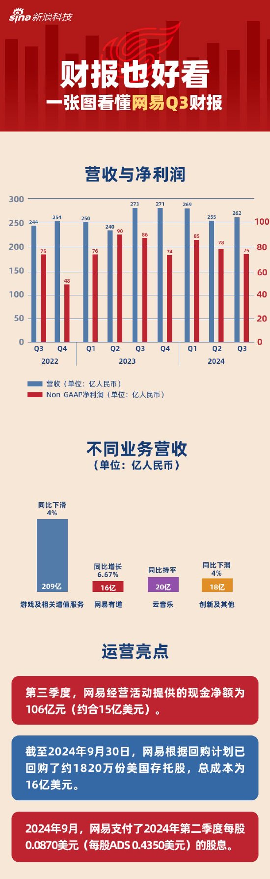 網(wǎng)易第三季度營收262億元(游戲209億+有道16億+云音樂20億+創(chuàng)新及其他18億),同比下滑3.9%;經(jīng)調(diào)凈利潤75億元,去年同期86億元。截至9月30日,網(wǎng)易根據(jù)回購計劃已回購了約1820萬份美國存托股,總成本為16億美元。