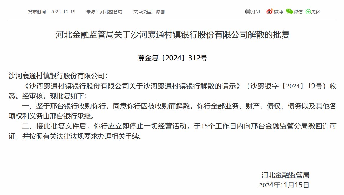 邢臺銀行收購合并 河北兩家村鎮(zhèn)銀行獲批解散