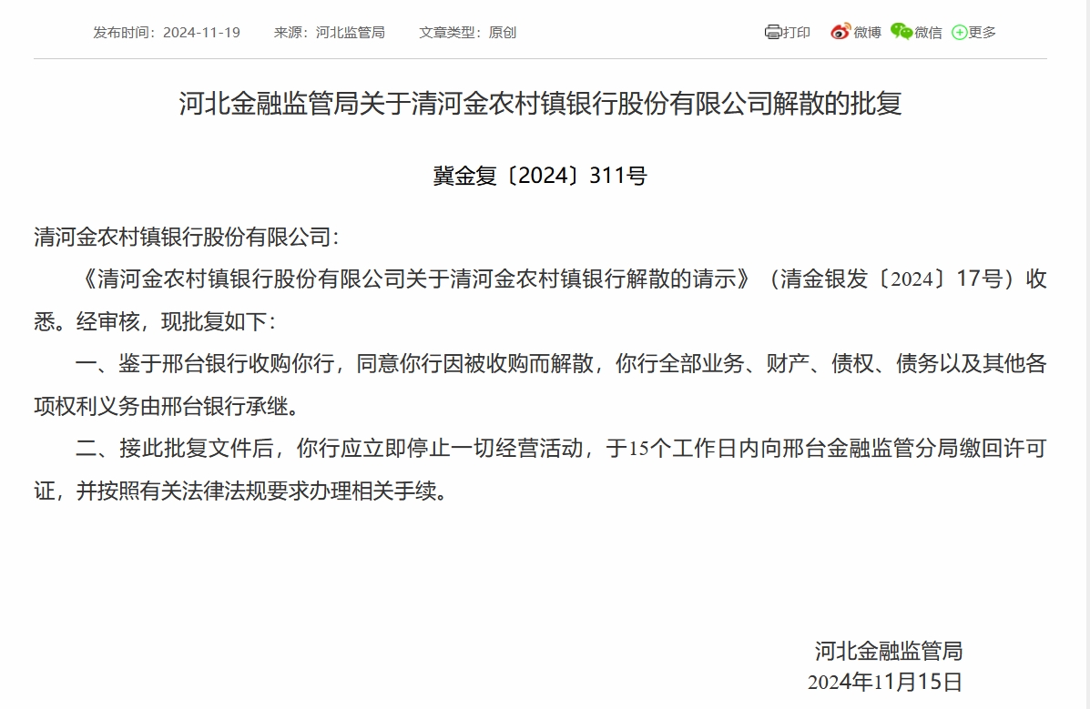 11月20日金融一線消息,國家金融監(jiān)督管理總局河北金融監(jiān)管局日前披露兩張批復顯示,批復同意沙河襄通村鎮(zhèn)銀行、清河金農(nóng)村鎮(zhèn)銀行解散。兩家銀行因邢臺銀行收購而解散,全部業(yè)務(wù)、財產(chǎn)、債權(quán)、債務(wù)以及其他各項權(quán)利義務(wù)由邢臺銀行承繼。