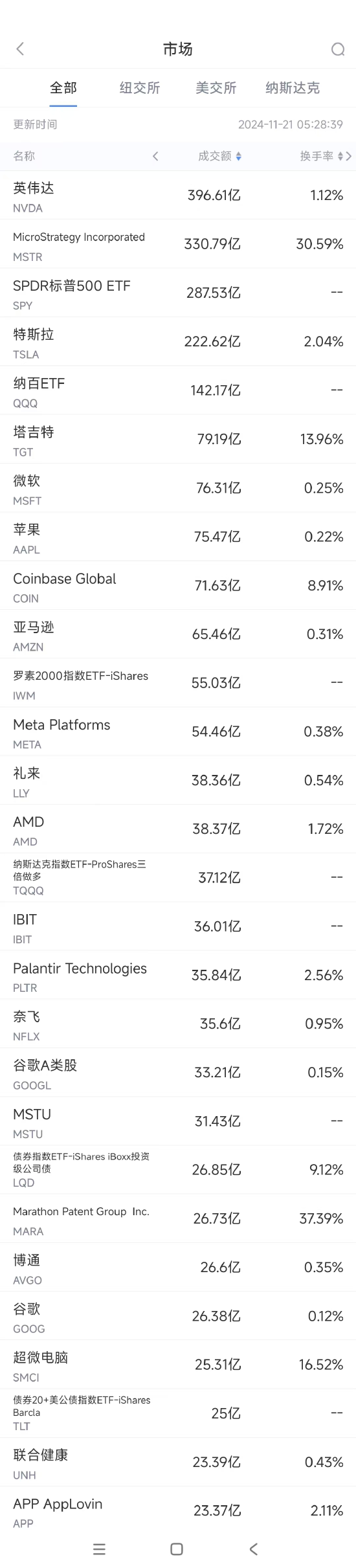 11月20日美股成交額前20:比特幣概念股MicroStrategy市值突破1000億美元