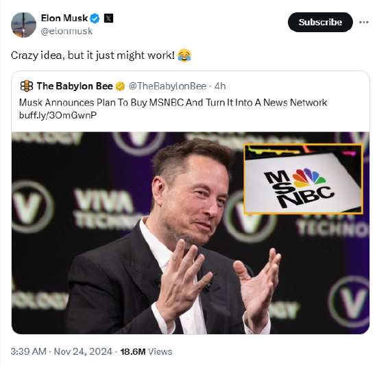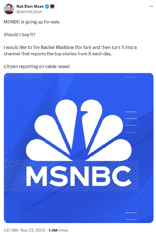 近日,有報道稱康卡斯特將拆出MSNBC、CNBC、Syfy和Golf Channel等娛樂和新聞頻道。馬斯克近日在X(推特)上發(fā)起討論,詢問網(wǎng)友自己是否應(yīng)該收購左翼媒體微軟全國廣播公司(MSNBC)。