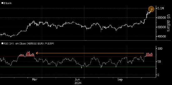 Miller Tabak + Co首席市場策略師Matt Maley表示,投資者擔心,比特幣已經(jīng)基本測試了10萬美元的水平,將不得不稍事休息;并補充說,圍繞比特幣的看漲情緒正變得極端。特朗普即將上任的美國 *** 被視為有利于加密貨幣。自11月5日共和黨獲勝以來,數(shù)位資產(chǎn)市場的整體價值增加了約1萬億美元。
