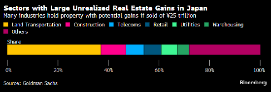 高盛估計,逾250家主營業(yè)務(wù)不是房地產(chǎn)的日本公司可能至少有25萬億日元的未實現(xiàn)收益。持有規(guī)模更大的一些公司來自鐵路、建筑和公用事業(yè)行業(yè)。