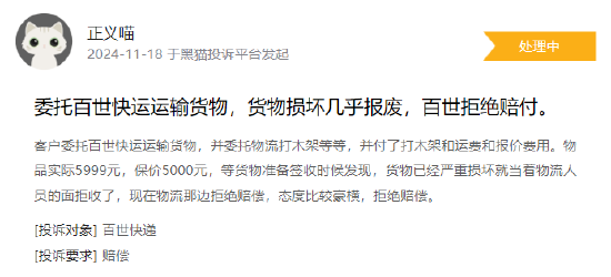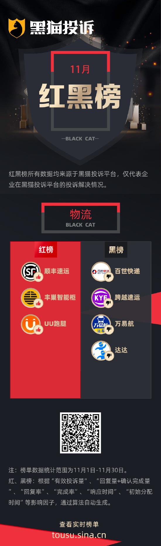 11月黑貓投訴物流領(lǐng)域紅黑榜:百世快遞貨物損壞拒絕賠償