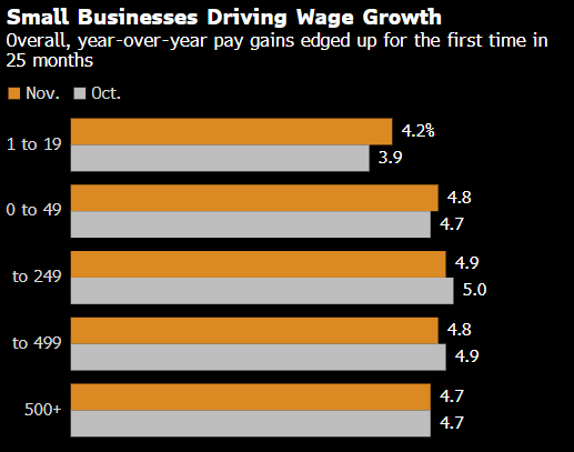 當(dāng)月雇員少于20人的公司的薪資同比增長4.2%,高于10月的3.9%,也是2022年初以來的更大增幅。