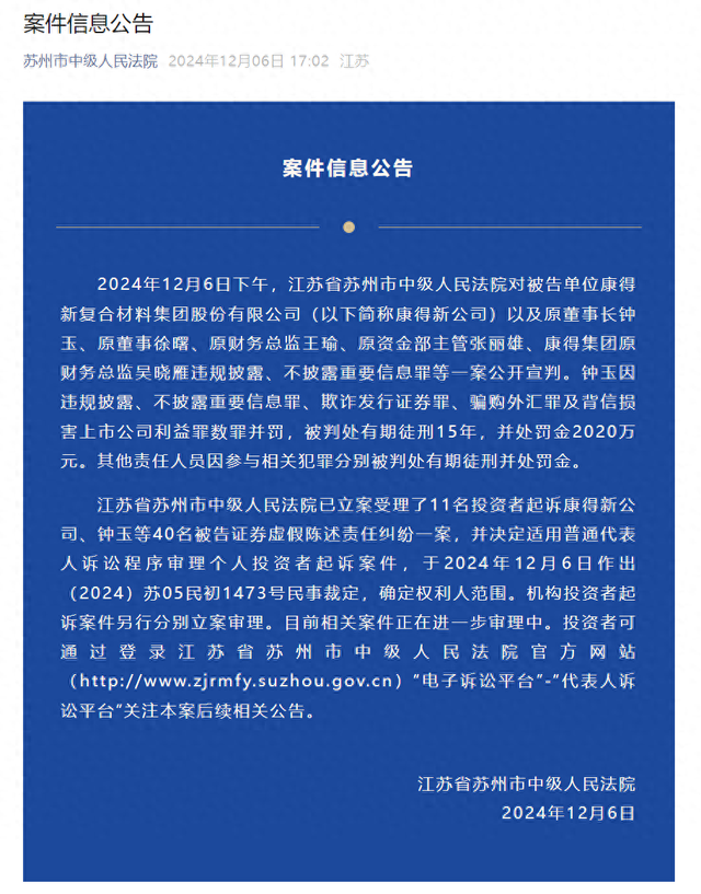 2024年12月6日下午,江蘇省蘇州市中級人民法院對被告單位康得新復(fù)合材料集團(tuán)股份有限公司(以下簡稱康得新公司)以及原董事長鐘玉、原董事徐曙、原財務(wù)總監(jiān)王瑜、原資金部主管張麗雄、康得集團(tuán)原財務(wù)總監(jiān)吳曉雁違規(guī)披露、不披露重要信息罪等一案公開宣判。鐘玉因違規(guī)披露、不披露重要信息罪、欺詐發(fā)行證券罪、騙購?fù)鈪R罪及背信損害上市公司利益罪數(shù)罪并罰,被判處有期徒刑15年,并處罰金2020萬元。其他責(zé)任人員因參與相關(guān)犯罪分別被判處有期徒刑并處罰金。