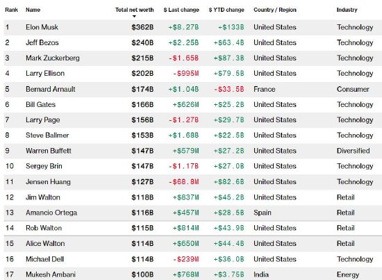 目前彭博億萬富翁指數(shù)上財(cái)富超過1000億美元的富豪共有17位,其中10位是美國科技富豪。