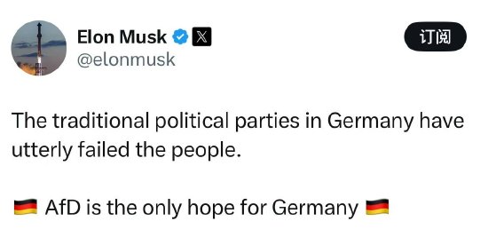 美國(guó)企業(yè)家埃隆·馬斯克表示,德國(guó)傳統(tǒng)政黨“完全辜負(fù)了”德國(guó)人民,并再次表達(dá)了他對(duì)“德國(guó)選擇黨”的支持。