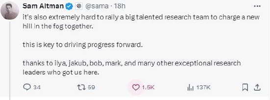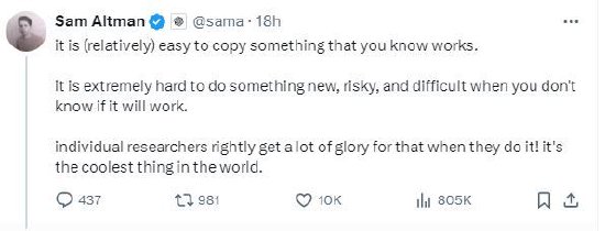 奧特曼在社交平臺X上發(fā)帖稱:“復(fù)制你知道行得通的東西是(相對)容易的。當(dāng)你不知道它是否行得通時(shí),做一些新的、有風(fēng)險(xiǎn)的、困難的事情是非常困難的。當(dāng)個(gè)人研究人員這樣做的時(shí)候,他們理所當(dāng)然地得到了很多榮譽(yù)!這是世界上最酷的事情?!?/p>