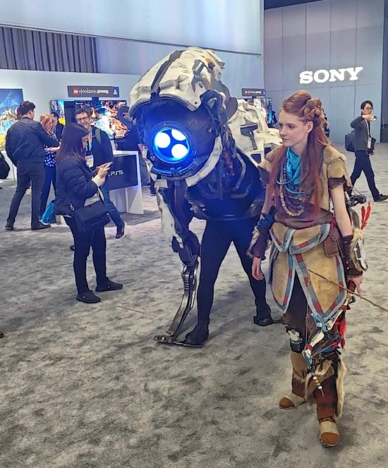 在索尼展臺(tái),有員工Cosplay《地平線:零之曙光》的主角與機(jī)械獸“逛展”,引發(fā)上百人圍觀。