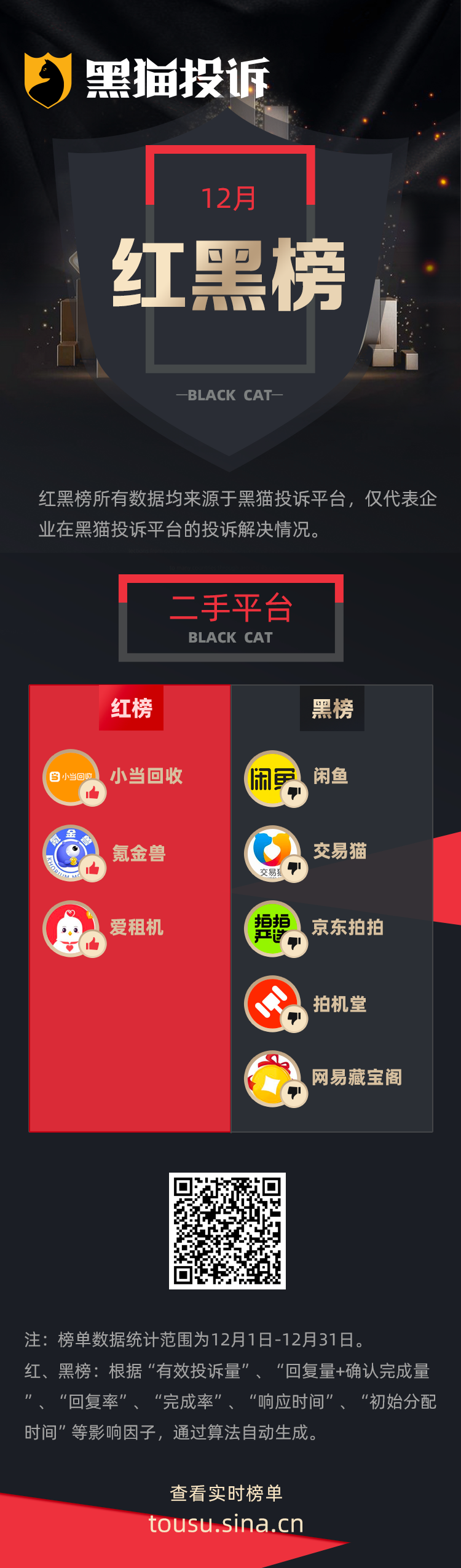 12月黑貓投訴二手交易平臺(tái)紅黑榜:閑魚(yú)驗(yàn)貨寶驗(yàn)貨報(bào)告與實(shí)際不符