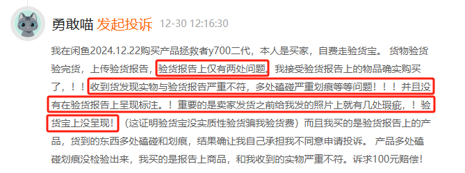 本月,有消費(fèi)者向黑貓投訴反饋,在閑魚(yú)購(gòu)買(mǎi)筆記本電腦前,自費(fèi)走了驗(yàn)貨寶,驗(yàn)貨報(bào)告顯示僅有兩處問(wèn)題,于是便下單了,但收 *** 后發(fā)現(xiàn)實(shí)物與驗(yàn)貨報(bào)告嚴(yán)重不符,多處磕碰、嚴(yán)重劃痕等問(wèn)題并沒(méi)有在報(bào)告上標(biāo)注,更重要的是賣(mài)家發(fā)貨之前發(fā)的照片上就有幾處瑕疵,報(bào)告同樣未標(biāo)注。