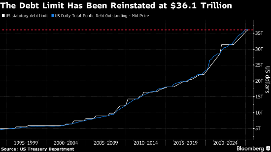 根據(jù)美國(guó)財(cái)政部周三披露的每日公告,截至1月14日,受制于上限的公共債務(wù)總額為36.087萬億美元。這僅比36.1萬億美元的上限低166億美元。