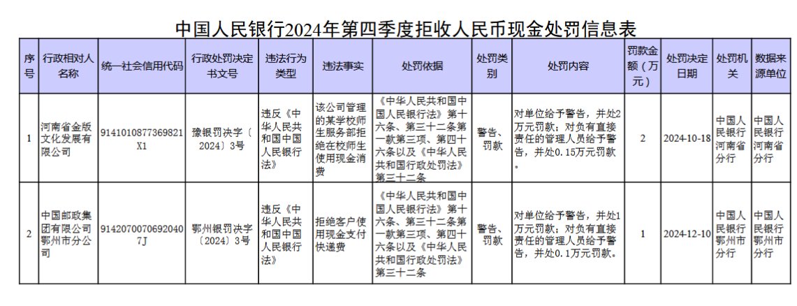 央行公布2024年第四季度拒收人民幣現(xiàn)金處罰情況 涉及中郵集團(tuán)等單位